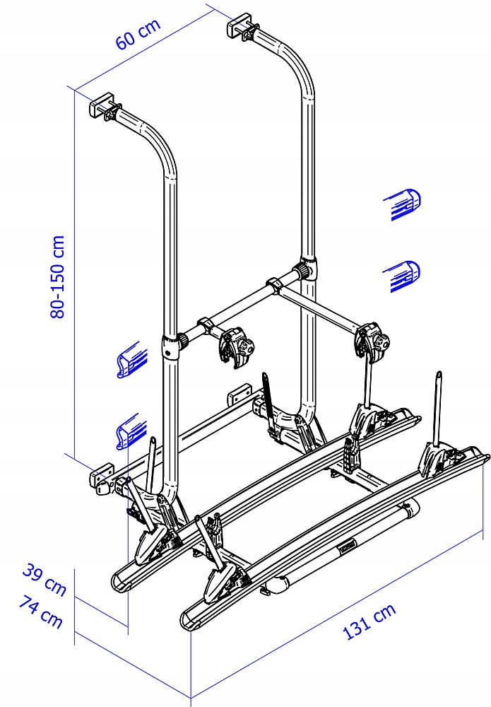 Szyny, mocowania kół i mocowania do ramy roweru można elastycznie przesuwać, aby zagwarantować optymalne mocowanie roweru.