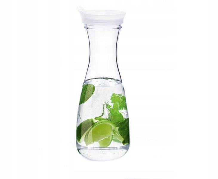 Wymiary: podstawa Ø10cm, pokrywka Ø6,5cm, wysokość 26,5cm. Pokrywka jest odkręcana i posiada otwór do nalewania (Ø ok. 3 cm). Materiał: akryl (dzbanek) i PP (pokrywka)