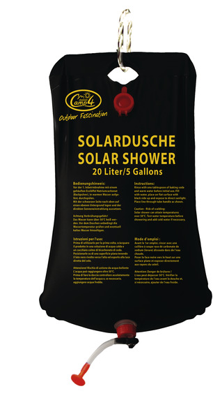 Przenośny, składany prysznic. Słońce podgrzewa zawartość wody do ok. 30 ° C w ciągu 2 do 3 h. Zamknięcie u góry i na głowicy natryskowej. Pojemność ok. 20 litrów.