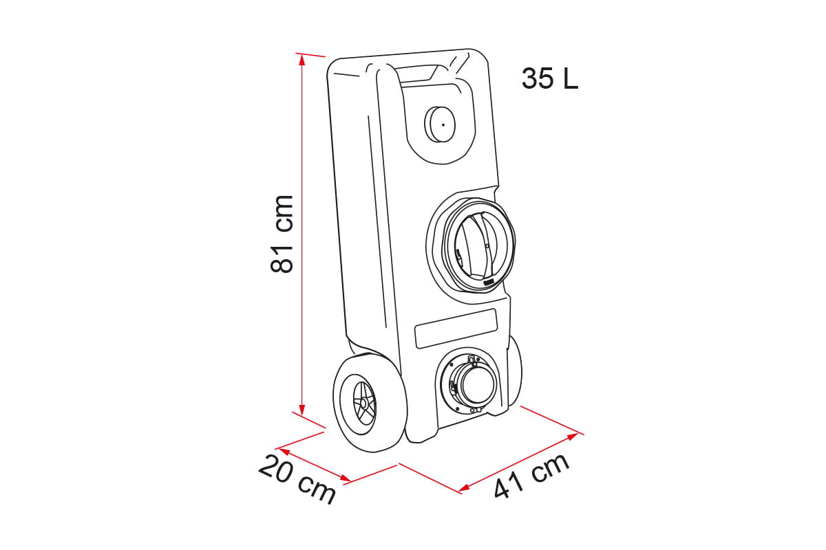 Przenośny 40-litrowy zbiornik na wodę pitną z wygodnym uchwytem i dwoma dużymi kółkami, które ułatwiają transport nawet na żwirze.